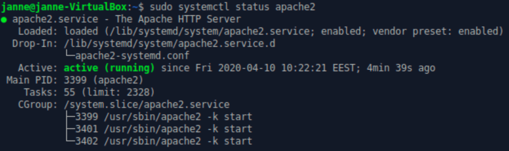 Asennuksen jälkeen hyväksyimme palomuurista Apache 2 komennolla sudo ufw allow 'Apache' ja sitten katsoimme apachen statuksen