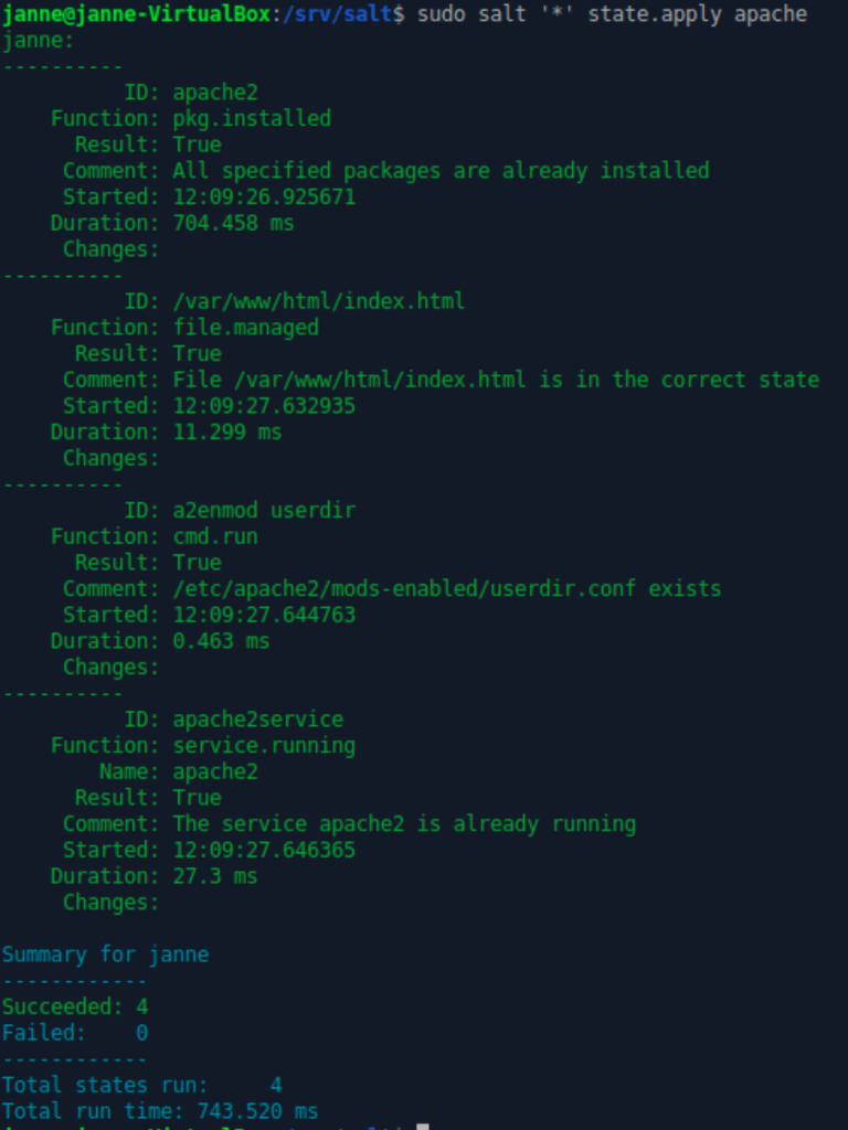 Testissä huomasin, että olisin voinut aikaisemmin poistaa apachen ennen pkg.installed komentoa idempontentissa, mutta päätin olla poistamatta, koska orjani toimii samassa koneessa, ettei tule mitään ongelmia.