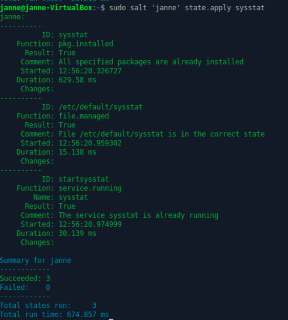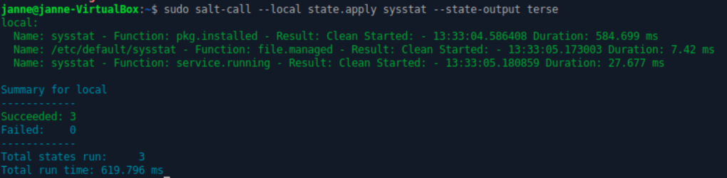 c) Aja jokin tila paikallisesti ilman master-slave arkkitehtuuria. Tutki debug-tulostetta. ’sudo salt-call –local state.apply hellotero –state-output terse’