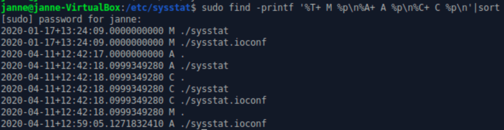 Kävin etsimässä find komennolla muuttuneet tiedostot /etc/sysstat kansiosta.